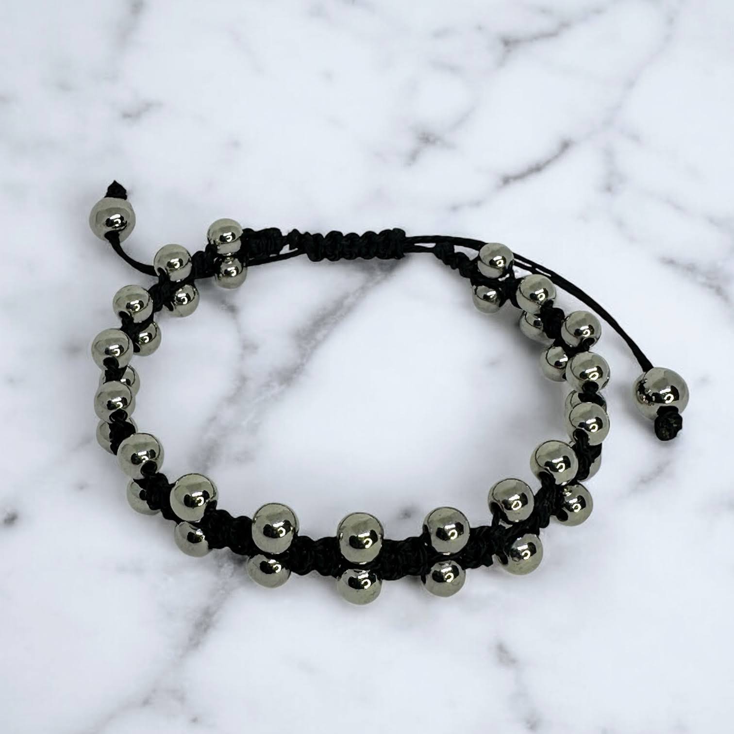 Silver beads with black macrame